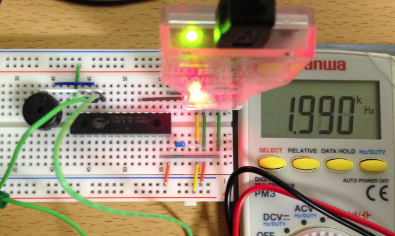 プログラムを書き込み、動かすとピーとなります。 P0[2]とP0[0]の周波数をテスターで調べて1.990と2kHzに近い値となっており、 無事割り込みが働いていることを確認することができました。
