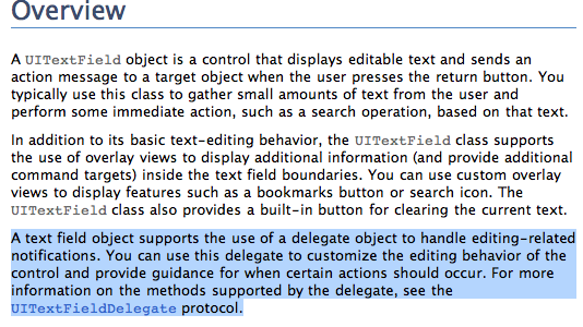 そこで、困ったときのマニュアルです。CopyTextViewController.hのUITextFieldをオプション-ダブルクリックすると以下のような説明がでます。