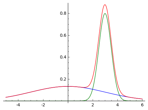 g01 = plot((_gauss(x, mu0, sig0^2)+ _gauss(x, mu1, sig1^2))/2, [x, -9, 9], rgbcolor='red')