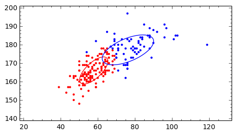 最後にScikit-learnの混合正規分布パッケージsklearn.mixtureを使って、 davisの体重・身長のデータに対して、混合正規分布を求めてみます。