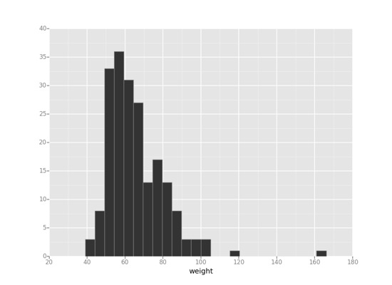ggplot(davis, aes(x='weight')) + geom_histogram(binwidth=5.0,color="grey")