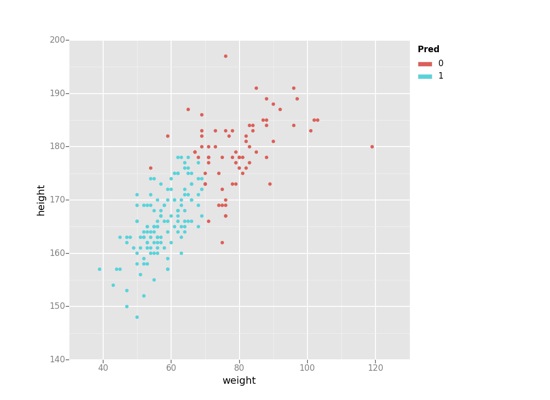 ggplot(davis_e11, aes(x='weight', y='height', colour='pred')) + geom_point()