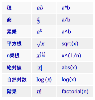 hdr=["積", "商", "累乗", "平方根", "n乗根", "絶対値", "自然対数", "階乗"]