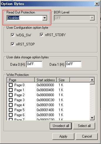 ST8Sのfirmwareは、そのままではRead Protectが掛かっているので、最初にこれを外します。