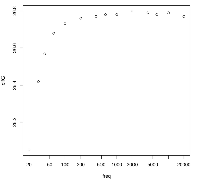 そこで、WaveGeneのサイン波の周波数を20Hzから20KHzまで適当にサンプリングして、 Sage でアンプの出力とオリジナルの信号の差を取ってプロットしたのが以下の図です。かなり計算値と近い結果になっています。