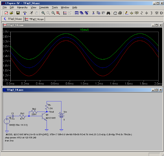 求まった値から抵抗220Kとし、回路にC1, Rb1を追加して、入力に50mVの1KHzのSin波をセットし、HBFを 120, 170, 240に変えてシミュレーションした結果を以下に示します。*3