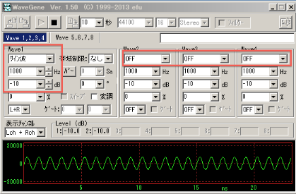 次に、波形発生ソフトWaveGene 1.5を起動し、Wave1を1KHzのサイン波、Wave2-4をオフにセットすると、 以下の様な波形が生成され、スピーカで聞くときれいなピーという音が聞こえます。