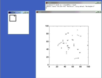 このデモでは、xevコマンドとEvent2Plot, Graphのシェルスクリプトをパイプでつないで、xplotの画面にイベントをリアルタイムでプロットします。