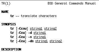 $ man tr | od -c | more 0000000 T R ( 1 ) 0000020 B S D G e 0000040 n e r a l C o m m a n d s M 0000060 a n u a l 0000100 T R ( 1 ) \n \n 0000120 N \b N A \b A M \b M E \b E \n 0000140 t \b t r \b r - - t r a n 0000160 s l a t e c h a r a c t e r s 0000200 \n \n S \b S Y \b Y N \b N O \b O P \b 0000220 P S \b S I \b I S \b S \n 0000240 t \b t r \b r [ - \b - C \b C c \b 0000260 c s \b s u \b u ] _ \b s _ \b t _ 0000300 \b r _ \b i _ \b n _ \b g _ \b 1 _ 0000320 \b s _ \b t _ \b r _ \b i _ \b n _ \b 0000340 g _ \b 2 \n t \b t r \b r 以下省略