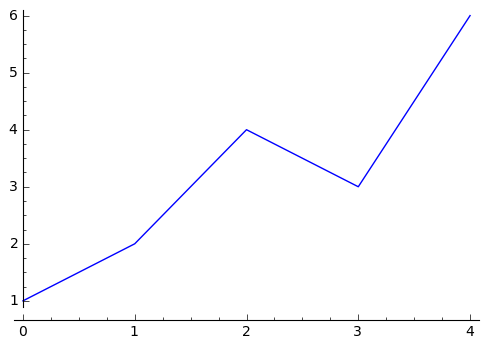 # データを結ぶ list_plot([1, 2, 4, 3, 6], plotjoined=True)