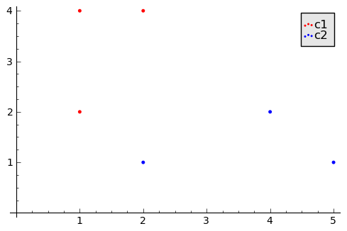 # データ(座標)のプロット c1 = [[1,2],[1,4],[2,4]] c2 = [[2,1],[5,1],[4,2]] # プロットして分布を確認 pl1 = list_plot(c1, rgbcolor='red', legend_label='c1') pl2 = list_plot(c2, rgbcolor ='blue', legend_label='c2') (pl1+pl2).show(xmin=0, xmax=5, ymin=0)