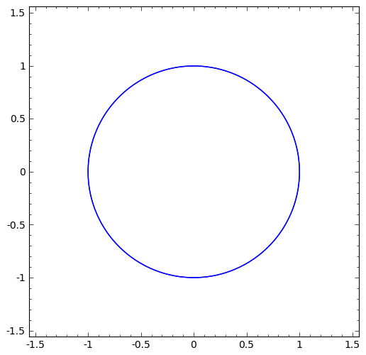 # 関係を満たすグラフを表示する x, y = var('x y') i_plt = implicit_plot(x^2 + y^2 == 1, [x, -1.5, 1.5], [y, -1.5, 1.5]) i_plt.show(aspect_ratio=1)