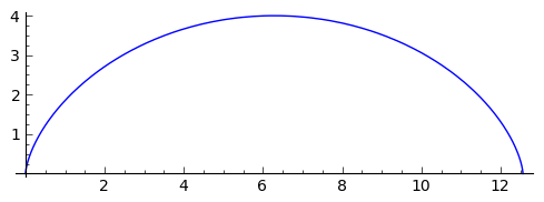 # 媒介変数表示 t = var('t') x = 2*(t-sin(t)) y = 2*(1-cos(t)) # サイクロイドのプロット(パラメトリックプロットの例) parametric_plot([x, y], (t, 0, 2*pi))