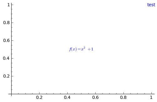 test_plt = text('test', (1, 1)) eq_plt = text('$f(x) = x^2 + 1$', (0.5,0.5)) (test_plt + eq_plt).show(xmin=0, ymin=0)