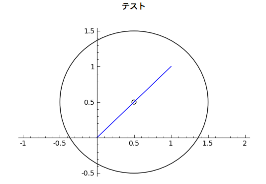 html('<center>テスト</center>') c = circle((0.5,0.5), 1) l = line([(0,0), (1, 1)]) pt = point((0.5, 0.5), rgbcolor='white', pointsize=30, faceted=True) (c + l + pt).show(xmin=-1, xmax=2)