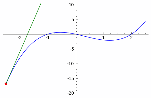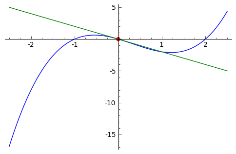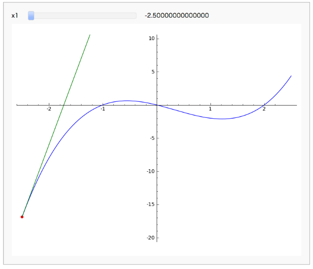 # 与えられたx座標でのfと接線のグラフを返す関数を定義 def _MyGraph(x1): y_plt = plot(y(x0=x1), [x, -2.5, 2.5], rgbcolor='green') pt = (x1, f(x=x1)) # x0, y0の座標をセット pt_plt = point(pt, rgbcolor='red', pointsize=30) return (f_plt + y_plt + pt_plt) # f_pltは先の結果を再利用
