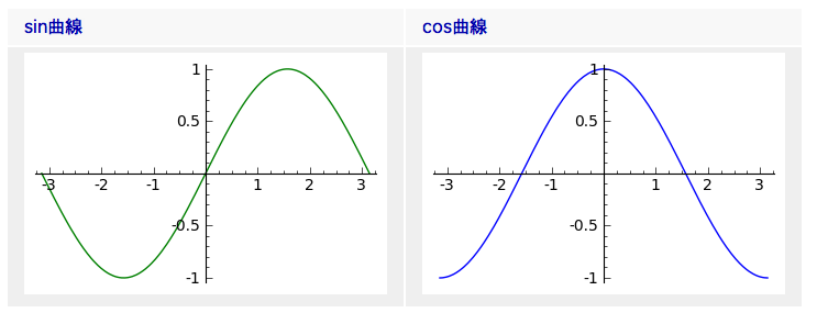 # グラフを並べて表示する sin_plt = plot(sin(x), [x, -pi, pi], rgbcolor= 'green', figsize=4) cos_plt = plot(cos(x), [x, -pi, pi], figsize=4) html.table([['sin曲線', 'cos曲線'], [sin_plt, cos_plt]])